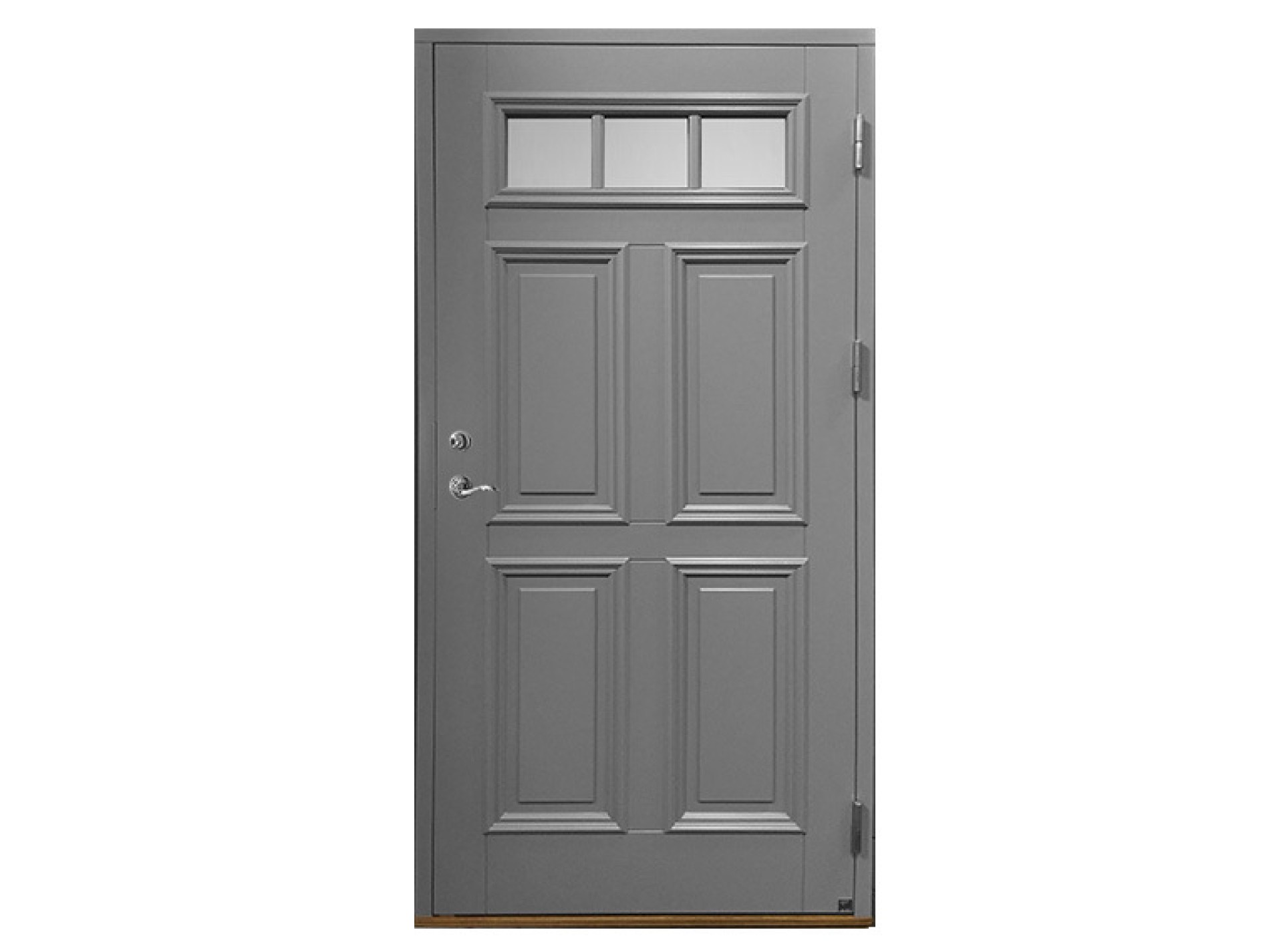 Gedigen ytterdörr med speglar i klassisk svensk design. Standard på denna modell är klarglas med spröjs SP 1:1. Som tillval kan man få Cotswold , hamrat eller etsat glas samt utförande i teak eller ek.