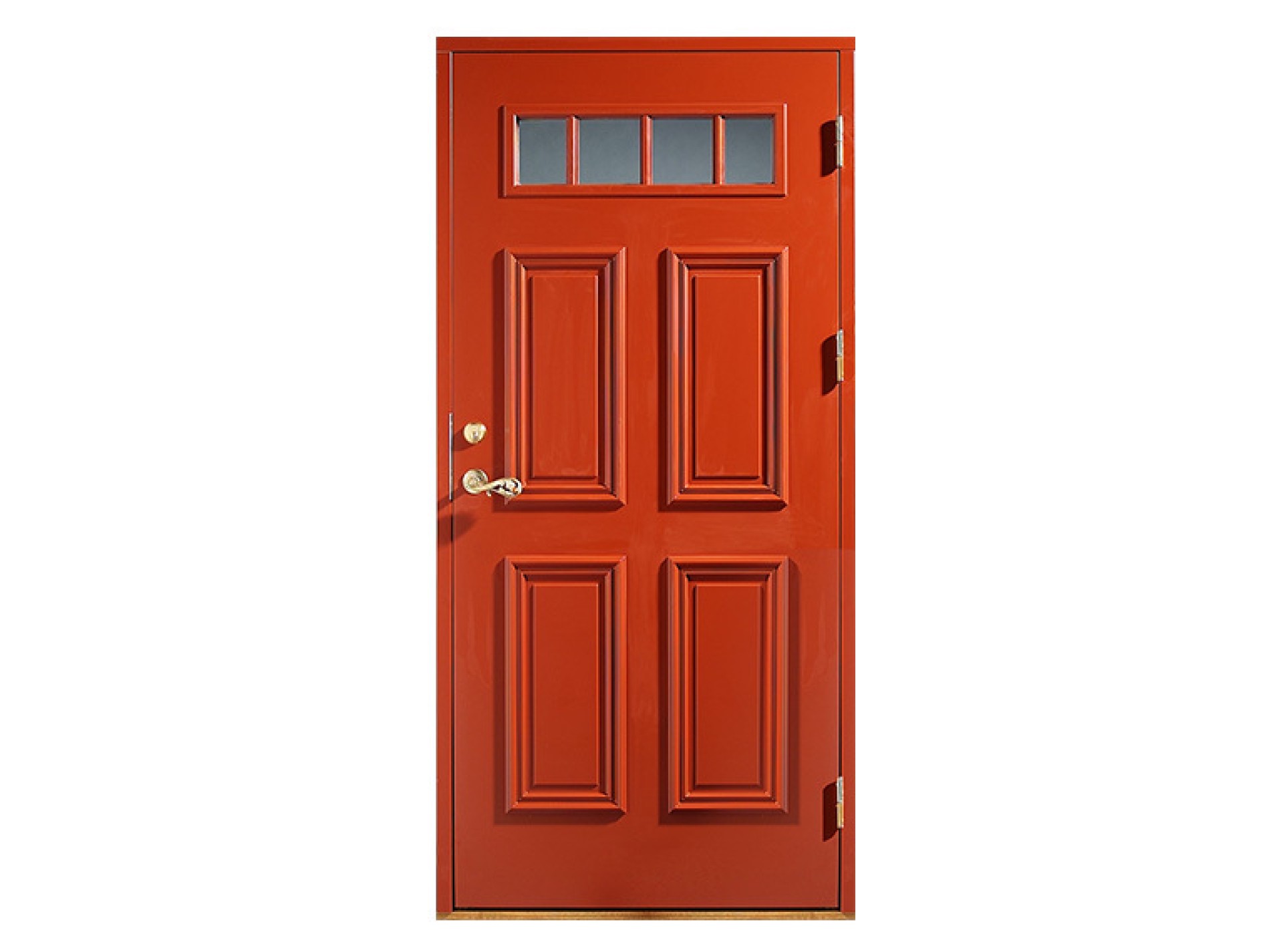 En gedigen och klassisk ytterdörr med vackra påläggningsspeglar. Standard på denna modell är klarglas med spröjs SP 0:3. Som tillval kan man få Cotswold , hamrat eller etsat glas samt utförande i teak eller ek.