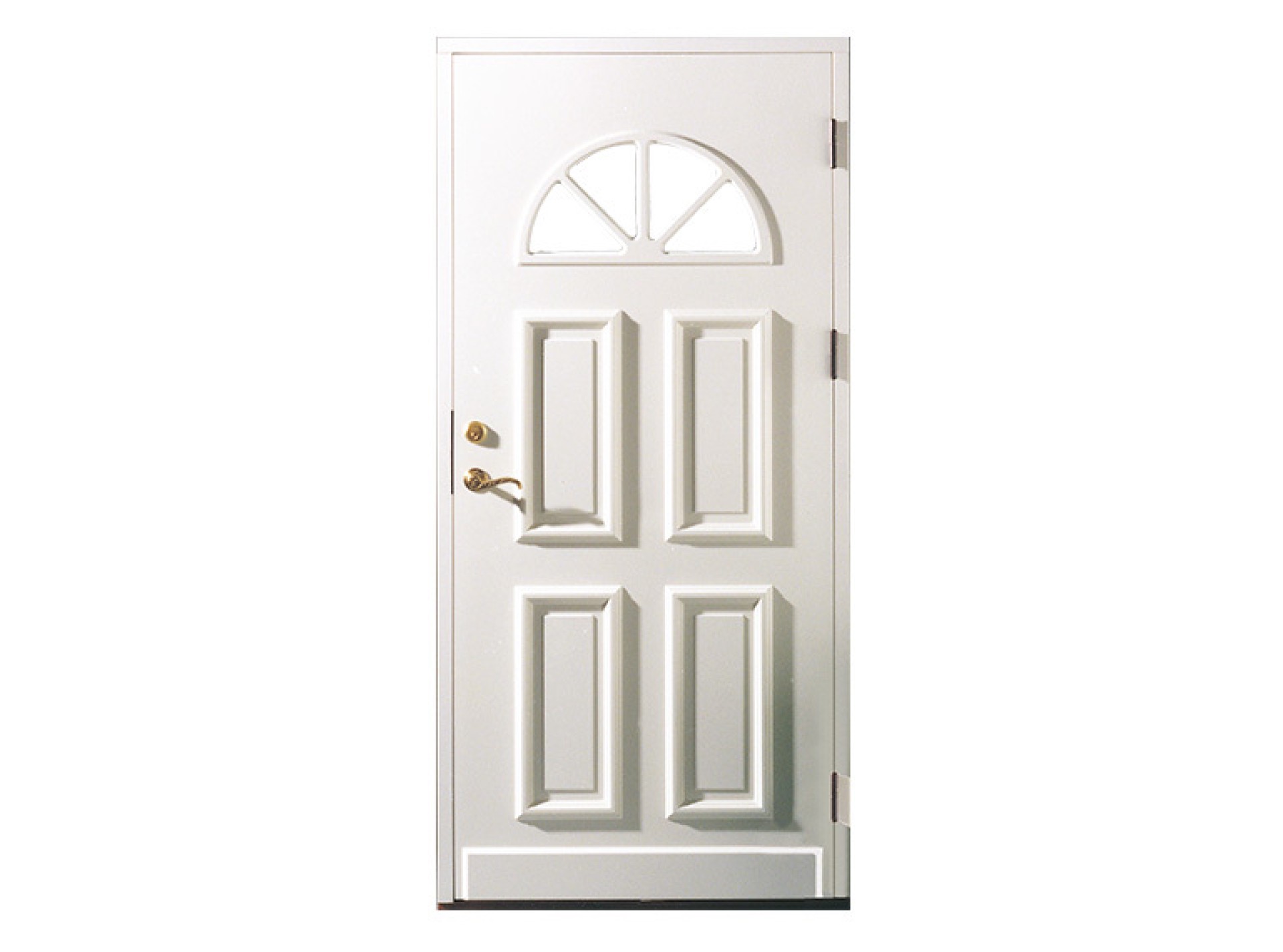 En gedigen och klassisk ytterdörr med vackra påläggningsspeglar. Standard på denna modell är halvmåneformat fönster med klarglas och spröjs SP 0:3. Som tillval kan man få Cotswold , hamrat eller etsat glas samt utförande i teak eller ek.