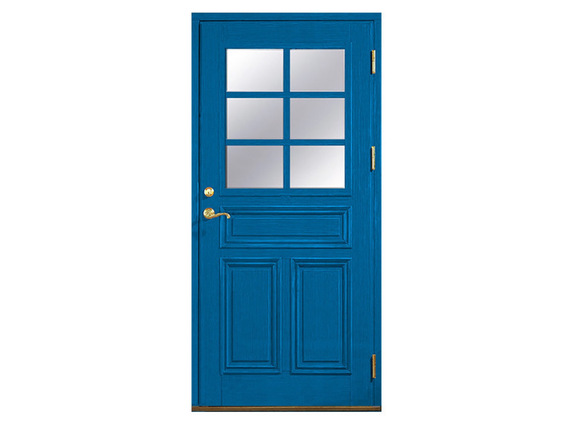 Gedigen ytterdörr med speglar i klassisk svensk design. Standard på denna modell är klart glas med spröjs SP 2:1. Som tillval kan man få Cotswold , hamrat eller etsat glas samt utförande i teak eller ek. Finns också som pardörr.