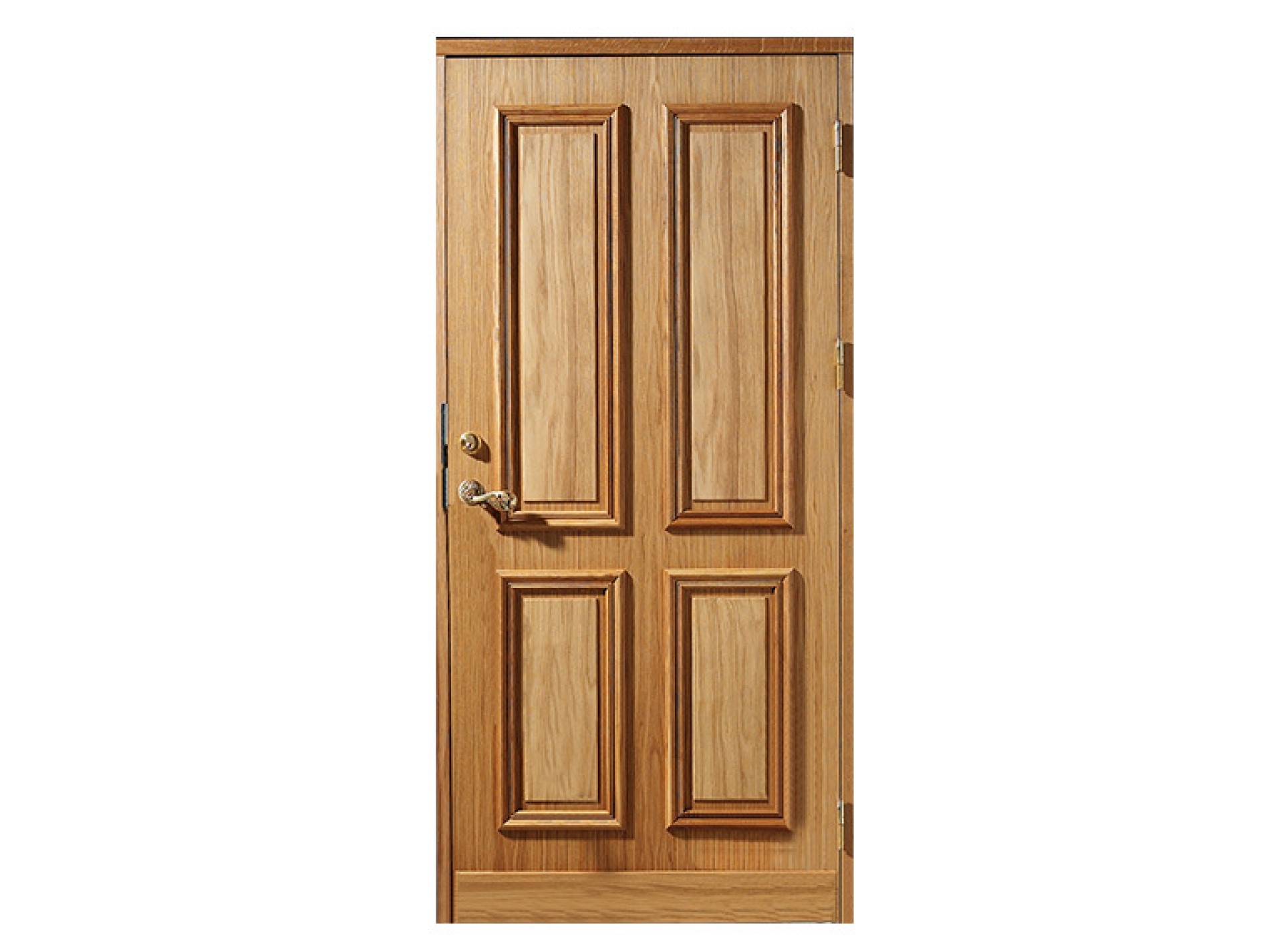 En rejäl och klassisk ytterdörr med påläggningsspeglar. Som tillval finns utförande i teak eller ek.