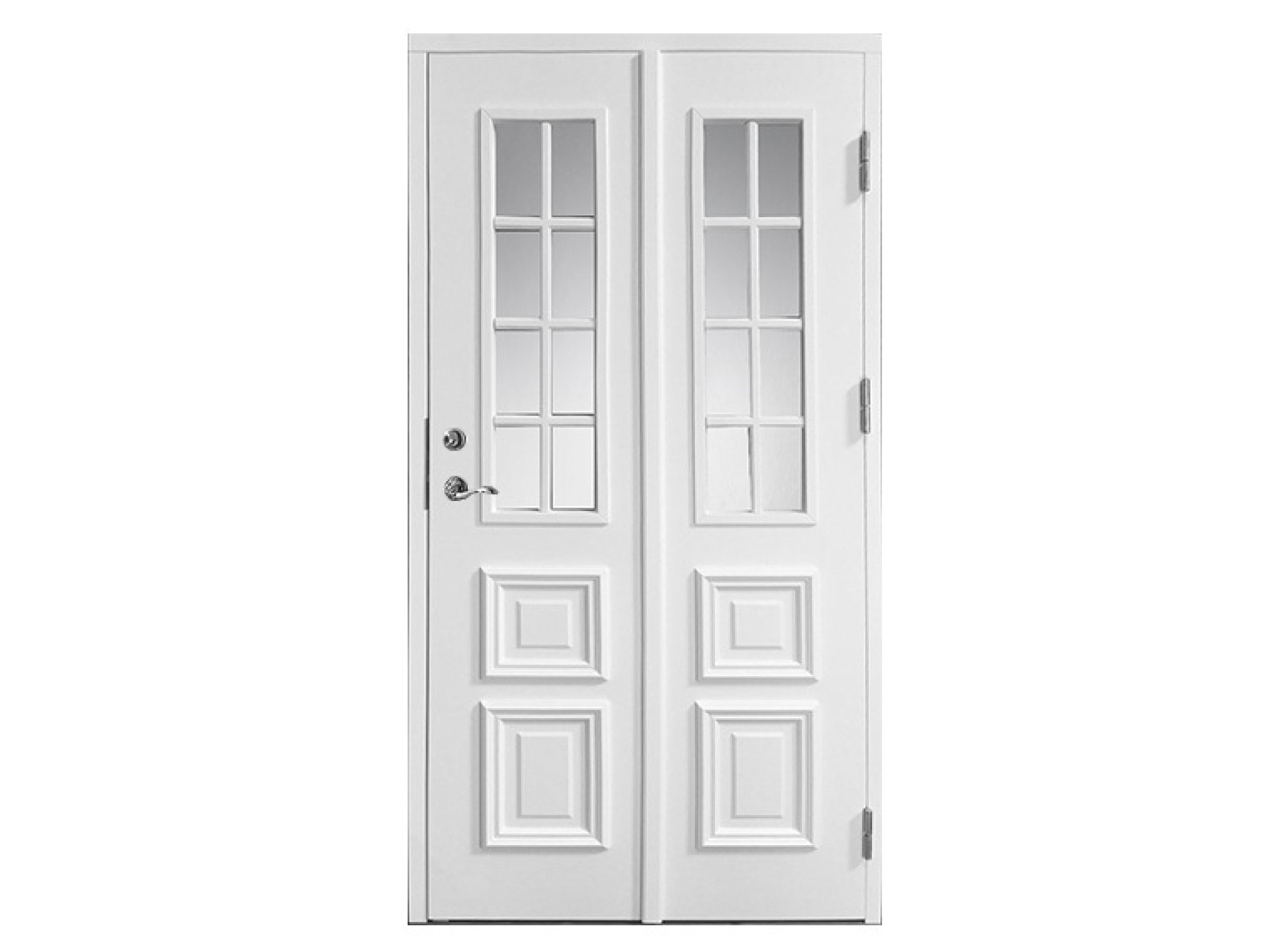 Ytterdörr i gammal stil med dubbla spröjsade fönster. Standard på denna modell är klarglas med spröjs SP3:1. Som tillval kan man få Cotswold , hamrat eller etsat glas. Dörrhalvorna speglas över en vertikal mittlist vilket ger intryck av en pardörr.